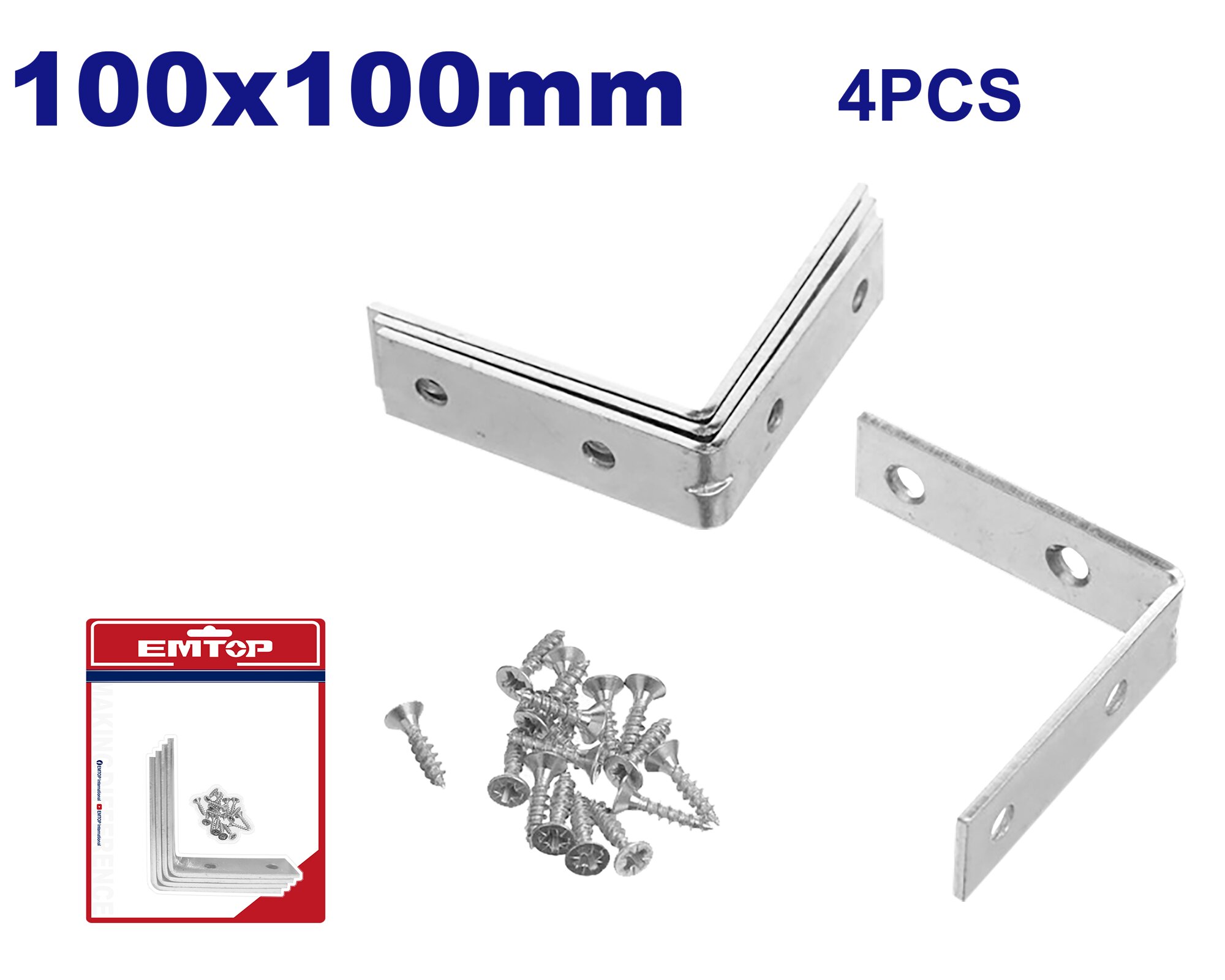4 Pcs Corner braceSize: 100*100mThickness: 1.9mmGalvanize surfaceIncludes 16 pcs fastenersPacked by blister card